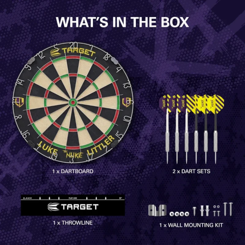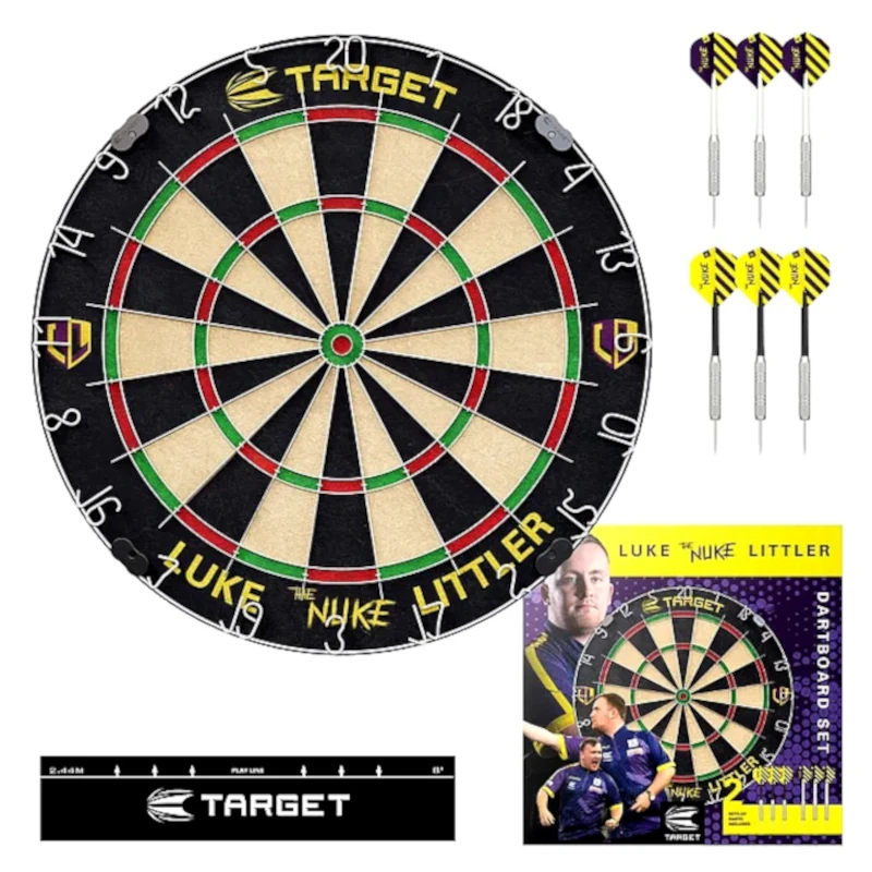 A Target Luke Littler darts tábla szett tökéletes választás minden darts rajongó számára, aki egy stílusos és komplett csomagot keres. A szett a fiatal tehetség, Luke Littler inspirációjával készült, és ideális otthoni használatra.