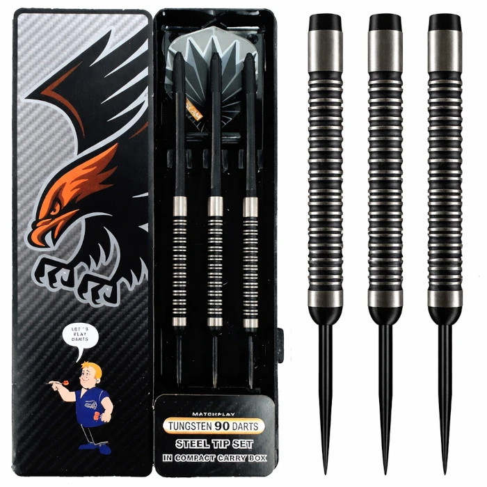 Prémium 90% tungsten darts nyilak versenyszintű 23 grammos súllyal. Modern dizájn, stabil és pontos dobások, komplett készlet tollakkal és szárakkal.