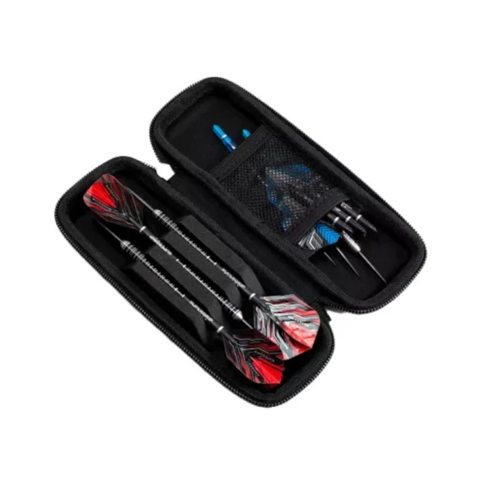 A tok akár egy komplett darts szett (nyilak, tollak, szárak) elhelyezésére is alkalmas, valamint extra rekeszekkel rendelkezik kiegészítők – például tartalék tollak, szárak vagy hegyek – számára. A látványos piros dizájn modern és sportos megjelenést kölcsönöz, amely garantáltan kitűnik a tömegből.