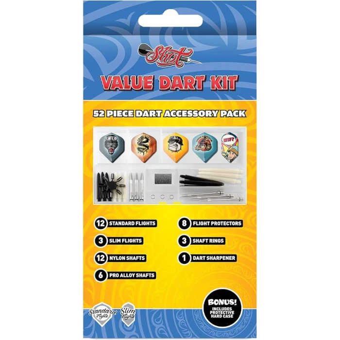 A Shot Value Range Darts Kiegészítő Szett mindent tartalmaz, amire szükséged lehet ahhoz, hogy finomhangold dobásaidat és megtaláld a számodra tökéletes darts beállítást. Ideális kezdőknek és haladó játékosoknak egyaránt, akik szeretnék kipróbálni a különböző flight- és szárkombinációkat.