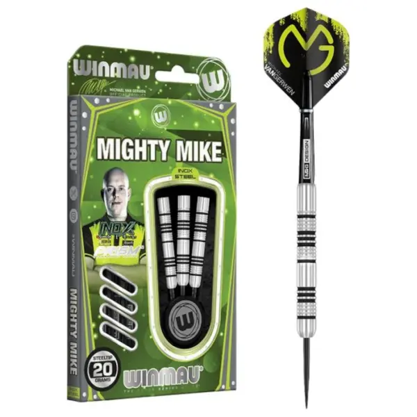 A Winmau MvG Mighty Mike Inox egy megbízható steel darts szett, amely kiváló választás mind hobbijátékosok, mind a darts világával most ismerkedők számára. A nyilak rozsdamentes acélból (Inox) készültek, így tartósak és ellenállók a mindennapi használat során.